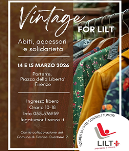 Trovare abiti tra abbigliamento uomo (anche sartoriale), abbigliamento donna, accessori e borse dal gusto retrò e contribuire, insieme, a sostenere la lotta contro il cancro. L'occasione è la prima edizione del mercatino di solidarietà “Vintage for Lilt” che si terrà al Parterre, in piazza della Libertà a Firenze, sabato 14 e domenica 15 marzo 2026, dalle ore 10.00 alle 18.00. Ingresso gratuito.