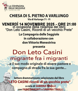 Venerdì 14 novembre 2025, alle ore 21.00, a Firenze nella Chiesa di San Pietro a Varlungo, in via di Varlungo 71, arriva in programma "Don Leto Casini, migrante fra i migranti", serata della Compagnia delle Seggiole con le letture di Fabio Baronti e Sabrina Tinalli dedicata a don Leto Casini (1902–1992), sacerdote fiorentino, Giusto tra le Nazioni e Medaglia d’oro al merito civile, esempio di carità operosa e coraggio civile.