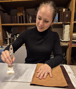 Sotto la guida di Andrea Brogi, “maestro legatore” di Signum, l’assessora Perini si è cimentata nella realizzazione di un quaderno artigianale. Il lavoro è partito dalla selezione della pelle da applicare sulle copertine, scoprendo così tutti i materiali, le texture ed i colori che caratterizzano lo stile della bottega. Da qui è iniziato il lavoro più artigianale: il taglio dei cartoni che avrebbero dato struttura alla copertina, il loro rivestimento con la pelle scelta e la preparazione delle parti esterne. Successivamente ha assemblato tutte le componenti, montando e pressando il quaderno affinché prendesse forma in modo armonioso e resistente. Le ultime rifiniture – lisciatura, controllo degli allineamenti, piccoli aggiustamenti di precisione – hanno chiuso l’esperienza, rivelando tutta la cura che si cela dietro ogni prodotto di legatoria.