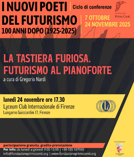 A conclusione del ciclo “I nuovi poeti del futurismo - 100 anni dopo (1925-2025)”, lunedì 24 novembre 2025, alle ore 17.30, al Lyceum Club Internazionale di Firenze in Palazzo Adami Lami, Lungarno Guicciardini, 17, si avrà l'occasione di ascoltare dalla voce e dalle mani del pianista Gregorio Nardi in "La tastiera furiosa: Futurismo al pianoforte", un approfondimento sulla musica pianistica del Futurismo italiano, con composizioni sempre interessanti (e, in alcuni casi, divertenti) di Felice Boghen, Franco Casavola, Alfredo Casella, Aldo Giuntini, Silvio Mix, Virgilio Mortari, Daniele Napoletano, Luigi Russolo e Alberto Savinio.