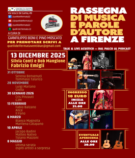 Continua la Rassegna “Musica e parole d’autore”: un percorso tra autori emergenti e navigati di “Quelli del fermata 22”. La terza serata è in programma sabato 13 dicembre 2025 alle ore 21.00, al Centro di Teatro Internazionale in via Vasco de Gama 49 a Firenze, con Silvia Conti e Bob Mangione e il cantautore romano Fabrizio Emigli, artisti noti e molto apprezzati nel panorama della canzone d’autore italiana.