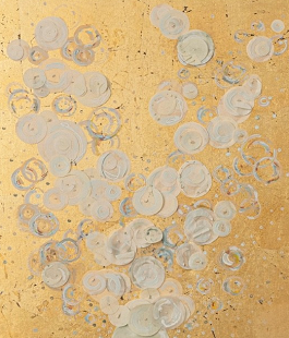 Cerchi, punti, linee ondulate su tonalità di blu, di verde, di oro. Blu come il mare, il cielo, le notti stellate, blu come la bellezza dei soffitti affrescati dai maestri del passato, blu come il manto della Vergine. Il verde, che richiama l’elemento naturale nelle sue molteplici componenti, sviluppa il tema del ricordo, il ricordo della campagna, di un mondo bucolico costellato da farfalle e api che si contrappone ad una contemporaneità in cui la natura diventa artificio e finzione. L’oro così prezioso nel farsi luce, nel farsi evocatore di spazio, di un luogo che si dilata, che respira e si fa specchio. Ma Simone Garofalo sceglie anche la profondità del nero, un colore capace di farsi potenza nella sovrapposizione di piani polimaterici in cui, evidentemente, spiritualità e conoscenza si fondono.