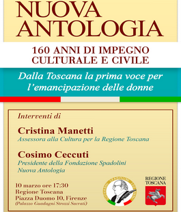 Martedì 10 marzo 2026 alle ore 17.30 nella sede della Regione Toscana, a Firenze in Palazzo Guadagni Strozzi Sacrati in Piazza del Duomo 10, si celebra la rivista "Nuova Antologia", una delle più antiche e prestigiose d'Europa, giunta al suo 160mo anno di pubblicazioni ininterrotte, che nacque proprio nel capoluogo toscano e che qui viene tutt'oggi redatta e pubblicata. Interventi di Cristina Manetti, Assessora alla Cultura per la Regione Toscana e Cosimo Ceccuti, Presidente della Fondazione Spadolini Nuova Antologia.
